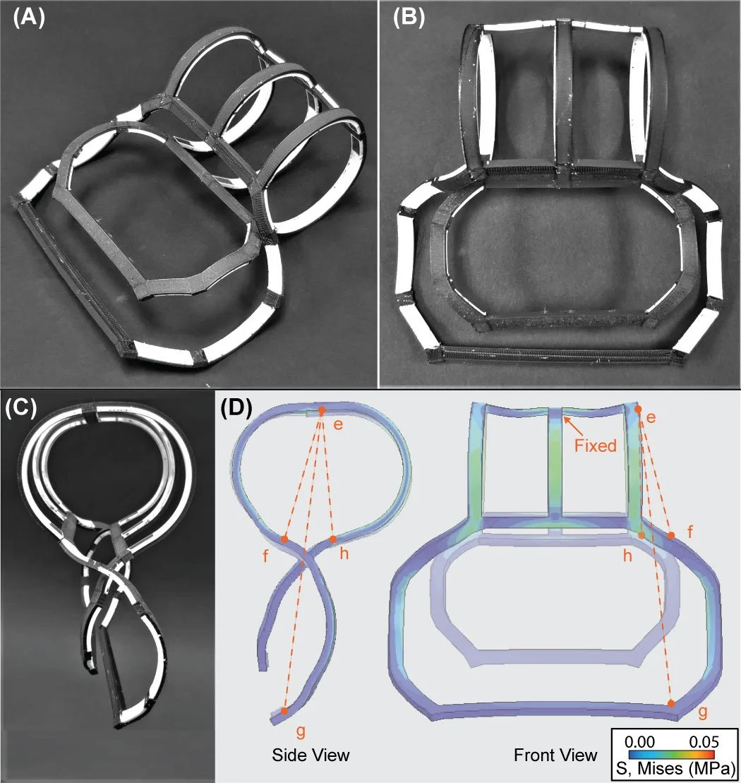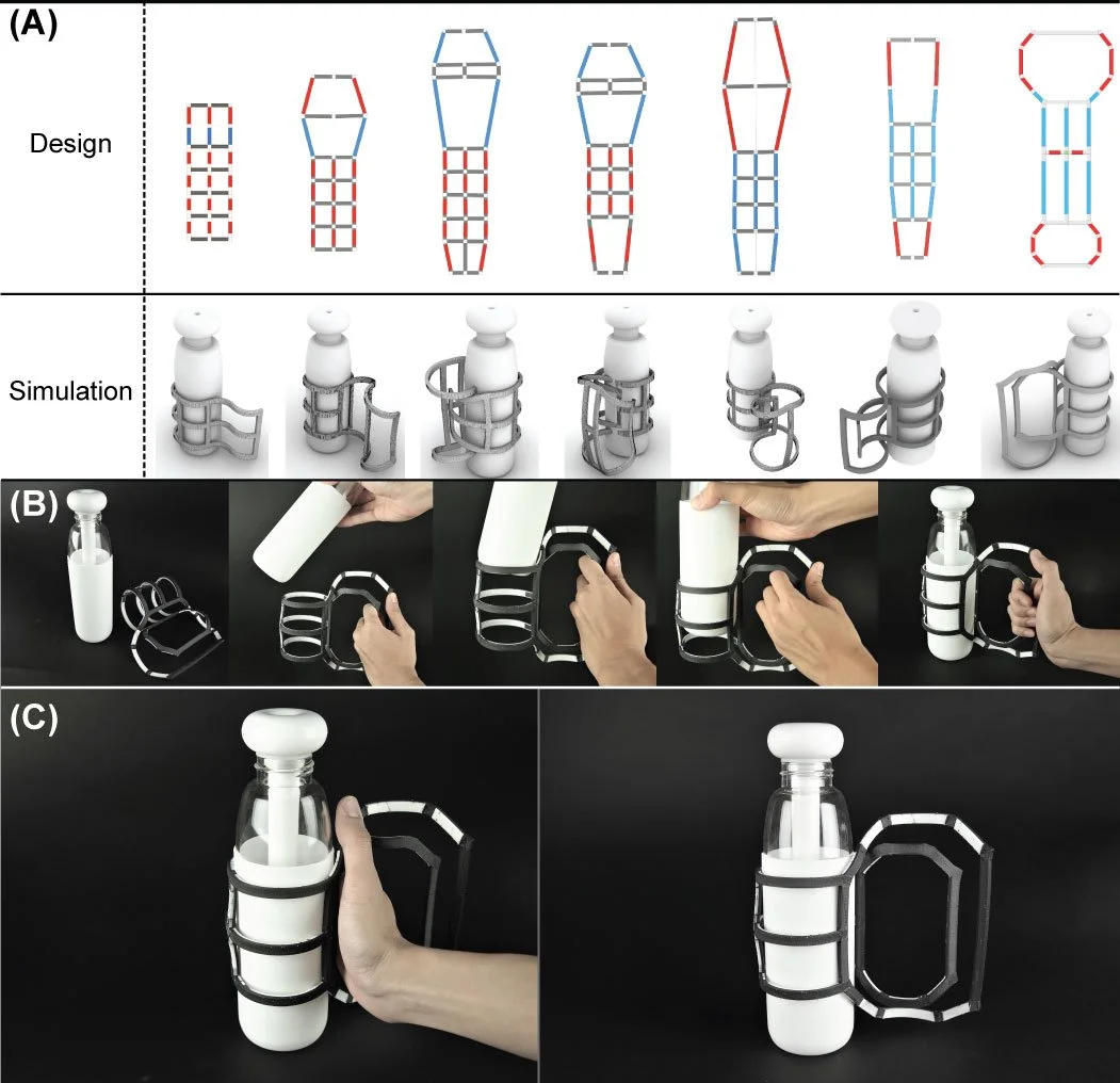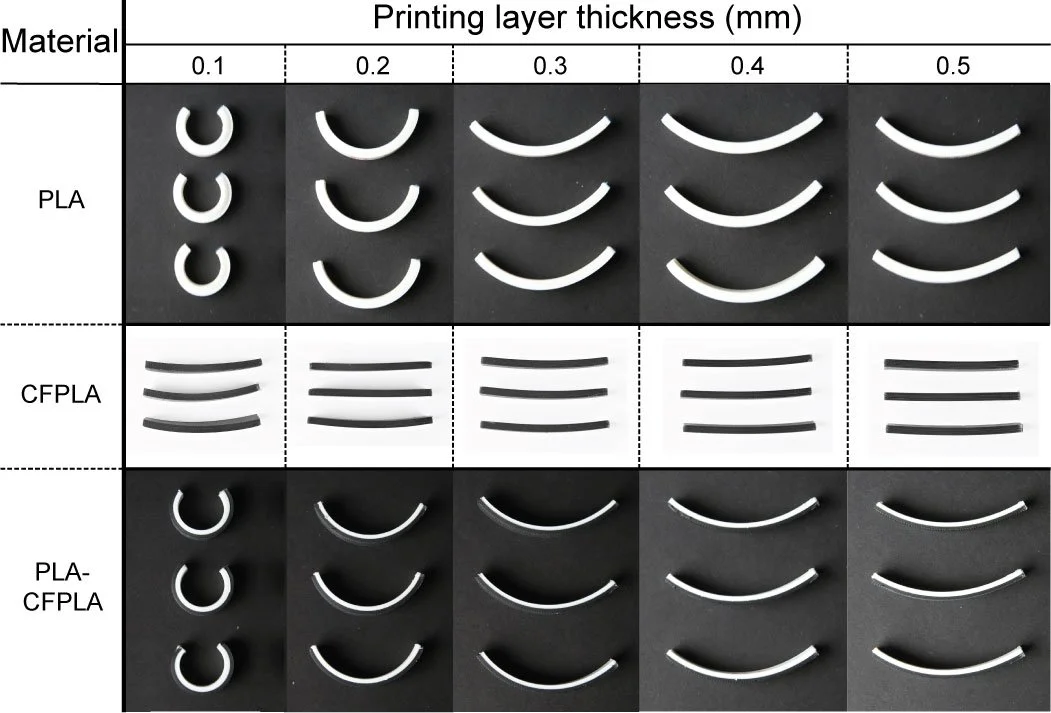 PLA, CFPLA, and PLA–CFPLA composite bi-layer blocks, with varying layer thicknesses from 0.1 mm to 0.5 mm. Results show that PLA bending units have the largest bending deformation while CFPLA bending units have the smallest bending deformation