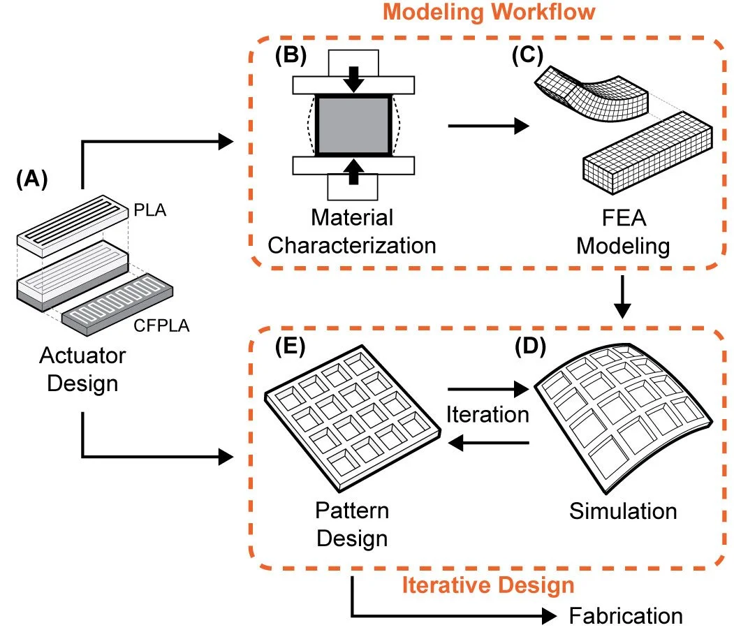 The workflow of iterative 4D printing design. (A) shows the structure of a block with PLA as an actuator and CFPLA as constraint. (B) shows the process of material characterization based on DMA experiments. (C) refers to the FEA modeling on a bending unit. (D–E) show the iterative design process based on the simulation. This iterative process yields the finalized design, and leads to fabrication